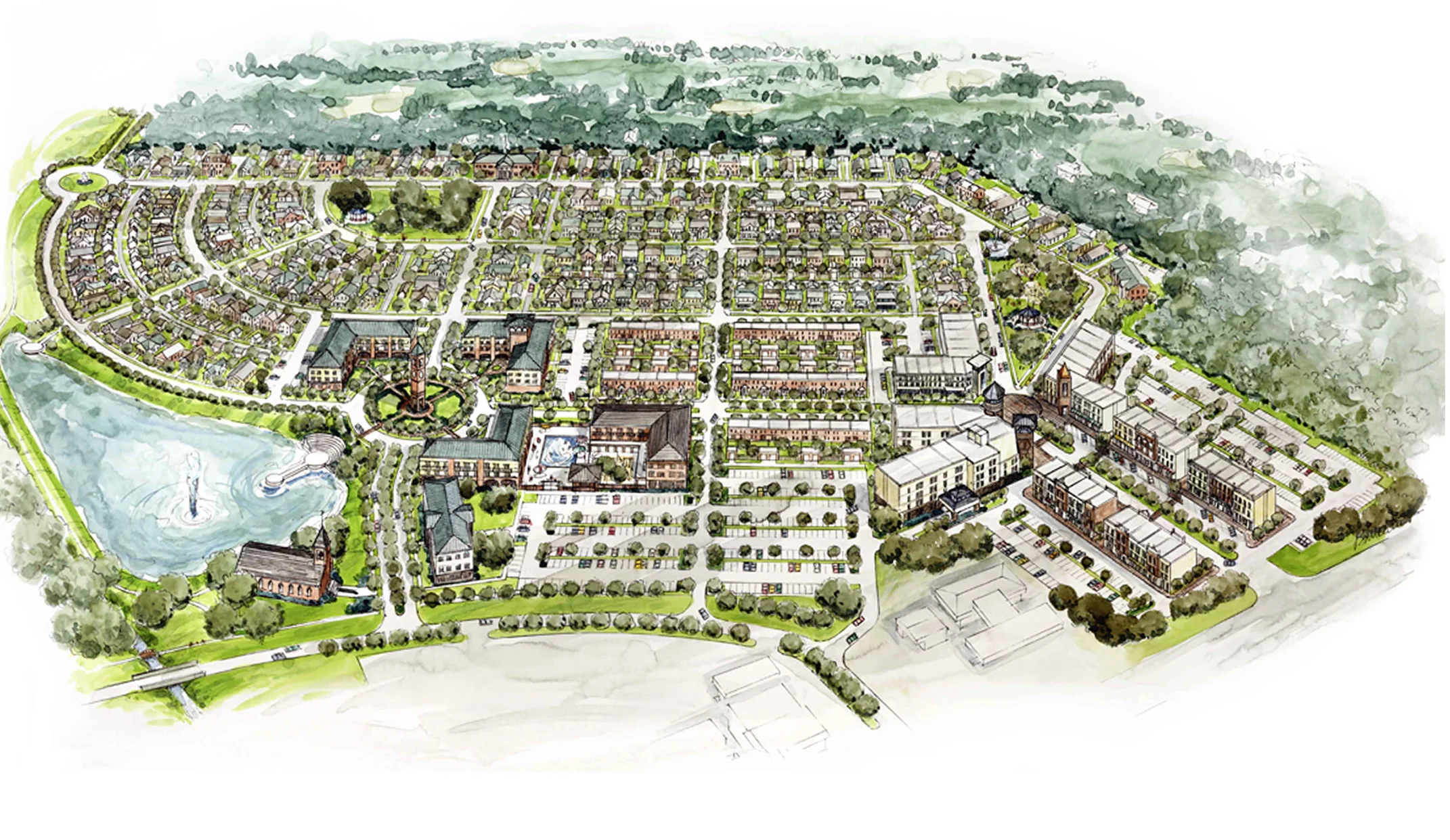 Program: 300 single-family, attached and detached houses; 350 apartments; 100,000 square feet of retail/office space; a hotel; a church; a charter school; community greenspace/parks; and a neighborhood center, with a library and community clubhouse/pool facility.